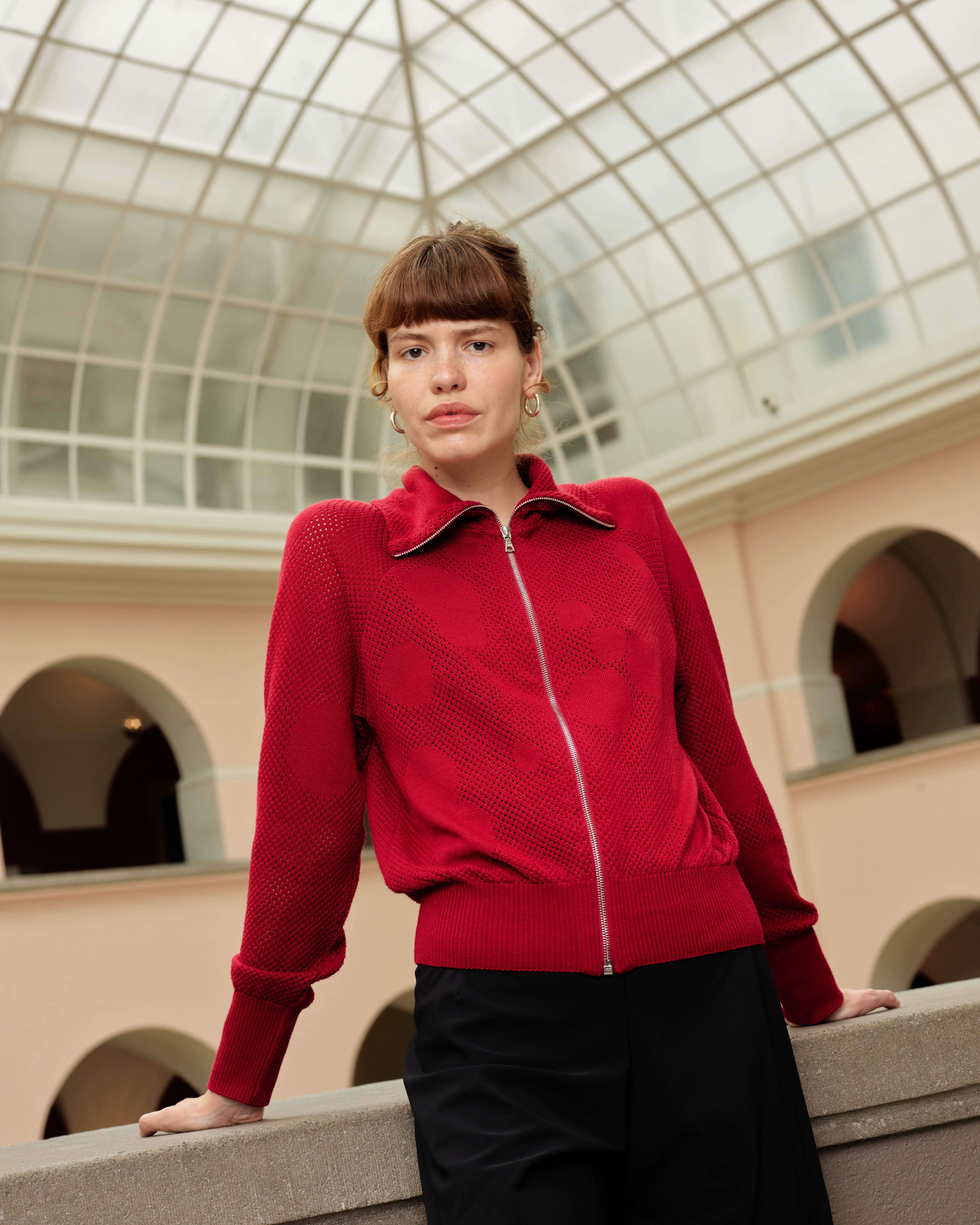 Inspiriert von dieser Forschung entwarf ALP eine Jacke mit unterschiedlich grossen Kreisen, die bakterielle Kolonien darstellen, die zu verschiedenen Zeitpunkten zu wachsen begonnen haben – ein Hinweis auf persistente Bakterien. Durch den Einsatz verschiedener Stricktechniken entstand ein monochromes Design, das sich durch kontrastierende Texturen sichtbar macht.
